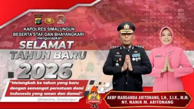 SIMALUNGUN – Tajamnews.co.id Dengan penuh harapan dan optimisme, jajaran Polres Simalungun yang dipimpin Kapolres AKBP Marganda Aritonang, S.H., S.I.K., M.M., bersama seluruh staf dan Bhayangkari menyampaikan ucapan selamat tahun baru 2026 kepada masyarakat Simalungun dan seluruh rakyat Indonesia.